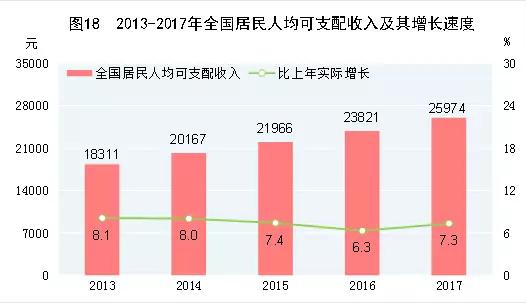 下图是公报中的“2013-2017年全国居民人均可支配收入及其增长速度”,虽然连年增长,但是到2017年底人均也不过是25974元。月均2000出头一点点。