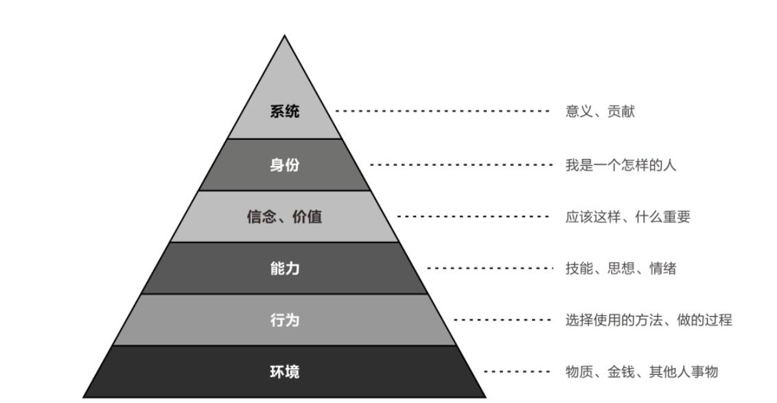 这说明,人的需求是有两层的:表层需求与深层需求。表层需求主要表现为对环境的需求,如物质和金钱;行为上的需求,如技能提升、良好的感觉;而深层需求有责任、原则、成功快乐、信念(应该这样)、身份(我是一个怎样的人)、意义(我的人生为系统做出了什么贡献)。