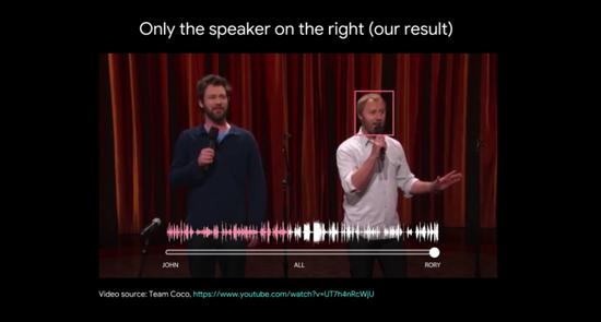 谷歌表示,这项技术可以应用与使用单一音轨的视频,并能在视频算法中隔离声音,这取决于谁在说话,或者是让用户手动选择他们想听到的声音的人脸。谷歌称,这里的视觉组件是关键,因为当某人的嘴在动时,这项技术会观察到,以便能在特定时刻更好地识别在某人的声音,并为视频的长度创建更精确的个人语音轨迹。