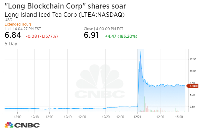 去年 12 月 22 日,来自纽约的饮料制造商长岛冰茶(Long Island Iced Tea)公司宣布,将正式更名为长岛区块链集团(Long Blockchain Corp)。