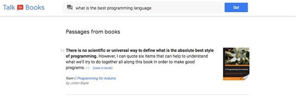 两个新工具第一个叫做 Talk to Books,用户在搜索栏提交问题后,AI会从书籍中找到于问题相关的答案:你陈述一件事或提出一个问题,这个工具就会在书中找出能回答你的句子,这种方法不依赖关键词匹配。从某种意义上来说,你在和书“交谈”,得到的回答可以帮助你确定自己是否有兴趣阅读它们。更像我们使用的歌词搜歌曲的功能。