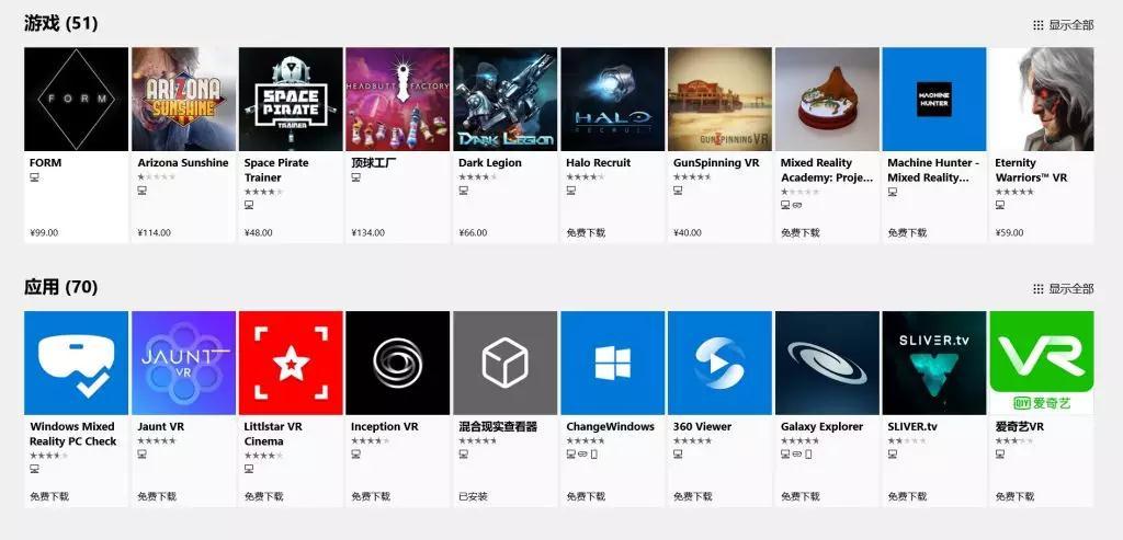 在微软MR头显发售之时,青亭网粗略统计,在Windows 10应用商店的MR应用中,游戏约22款,应用约17款,游戏占比约56%;截止发稿时,青亭网根据Windows应用商店显示数据,MR应用为70款,而MR游戏为51款,游戏占据约37%。这也能侧面印证,微软应用商店似乎并没有将游戏作为VR的主要发力点。
