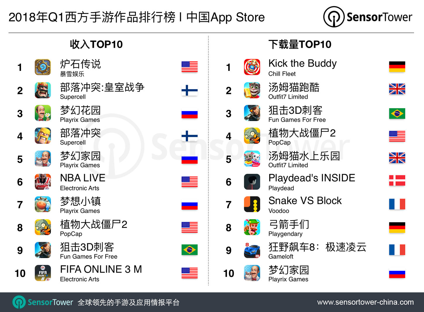 Sensor Tower商店情报Store Intelligence平台监测到,刚过去的2018年第一季度期间,美国暴雪娱乐旗下经典作品《炉石传说》和德国开发商Chill Fleet去年底出品的《Kick the Buddy》分别登顶中国App Store西方手游吸金量及下载量TOP10榜单。同时,下载榜上的领衔作品所代表的西方开发商相比收入榜更加多样,国家和开发商数量均更多。