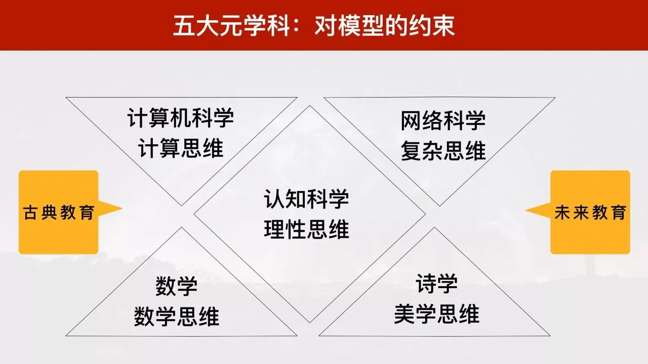 如果只学习古典教育,会出现什么问题?你会成为智慧的人?你会成为当代国学大师?不,你只会穷困潦倒。这就涉及第二个黄金三角形:未来教育。