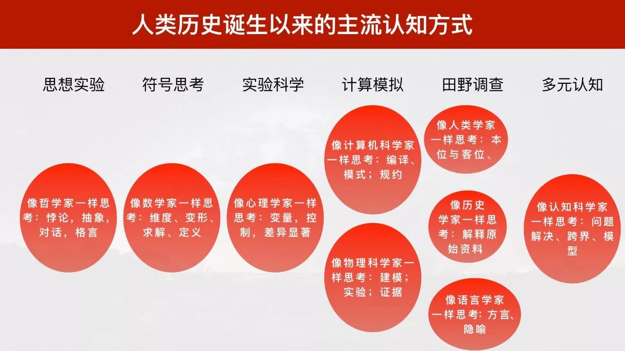 多元认知就意味着你综合使用多种认知方式,这就是认知科学家常用的认知方式。 认知科学有六个母亲:哲学、心理学、语言学、计算机科学、人类学与神经科学,这六个母亲,涉及上述五种认知方式。参考认知科学家的常用术语,我将多元认知的要点总结为:问题解决、跨界、模型。对认知科学家来说,他的使命就是不断求解人类心智之谜,定义一个好的问题,寻找到一个好的模型,赋予一个好的解答。