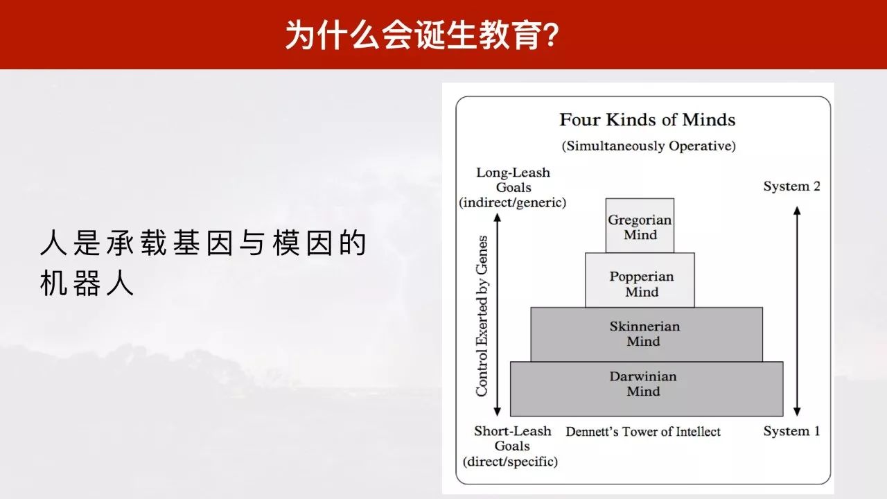第一层达尔文心智与第二层斯金纳心智是所有动物共有的。第三层波普尔心智和第四层格列高利心智是人类独有的心智。