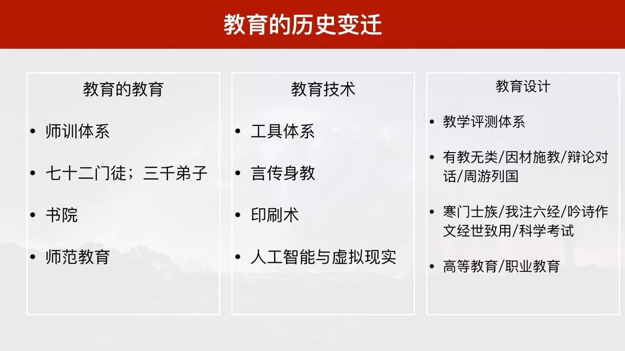 教育的教育指的是师训体系。 原始社会承担师训体系的是巫师、祭司。到了春秋战国时期,中国历史上第一位教育家孔子出现了。他有自己的师训体系:七十二门徒;三千弟子。教育技术指的是工具体系。 与墨家相对比,孔子当时并没有掌握什么先进工具,只能言传身教,带着弟子周游列国。在今天,不太可能有哪位老师带着你数年奔波,周游列国。这是一件浪漫但低效率的事情。