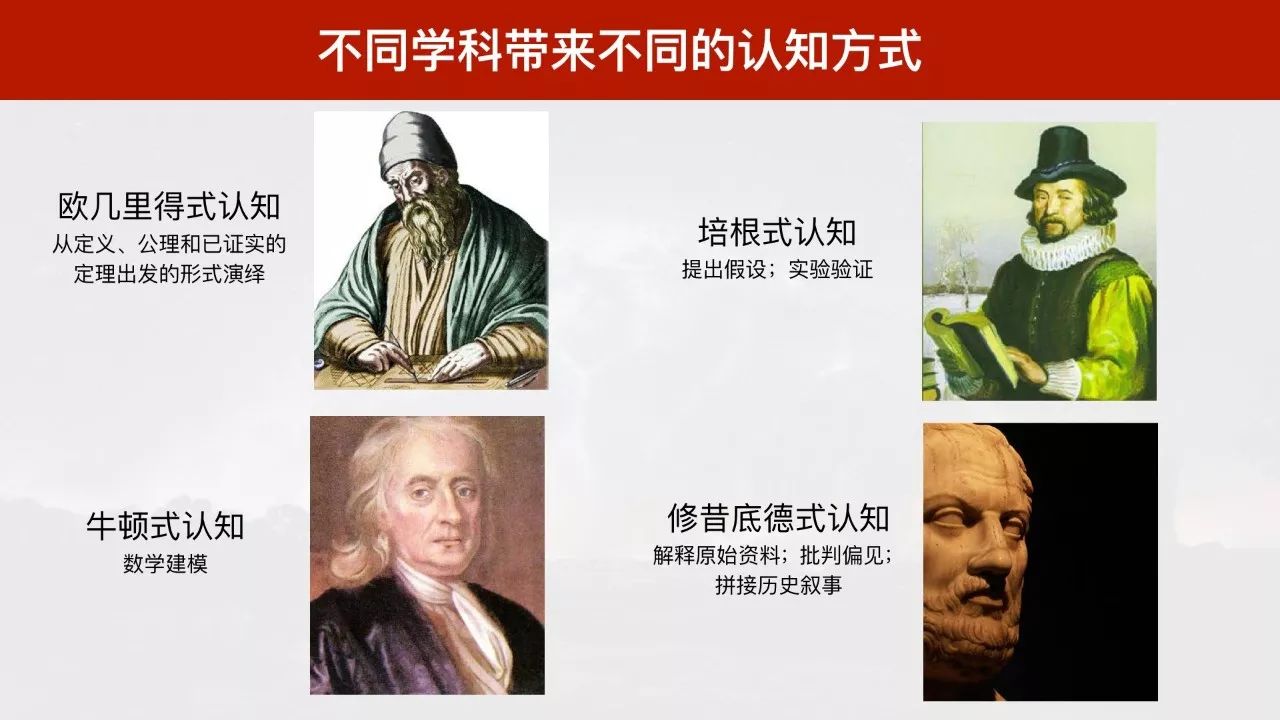 帕金斯在著作中曾提及不同学科带来的四种常见认知方式。第一种是欧几里得式认知,侧重从定义、公理和已证实的定理出发,进行形式演绎。第二种是牛顿式认知,强调通过数学对真实世界进行建模。第三种是培根式认知,侧重提出假设;再通过实验来进行验证。第四种是修昔底德式认知,这是以古希腊的第一位历史学家命名的认知方式,它侧重收集历史上的原始资料,然后解释历史资料,并对历史上已有的他人解释进行批判,最后将资料、见解、批判拼接为一个新的历史叙事。