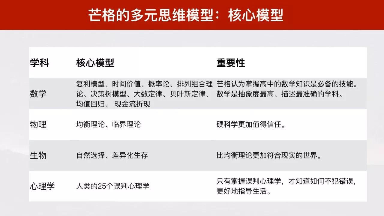 芒格反复提及的核心模型出自数学、物理、生物与心理学四个领域,如下图所示: