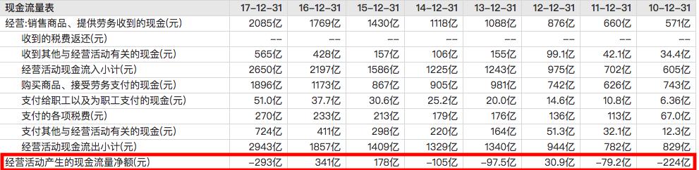 -293亿元,这是保利地产2017年经营活动产生的现金流量净额。上一次保利现金流为负还是2014年。