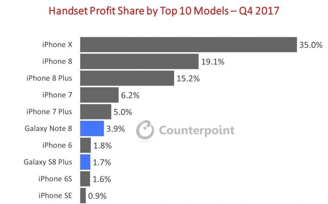 Counterpoint的数据显示,iPhone X是去年四季度最赚钱的智能手机。从11月初上市算起,iPhone X只用了两个月的时间就占了行业里21%的收入和35%的利润。