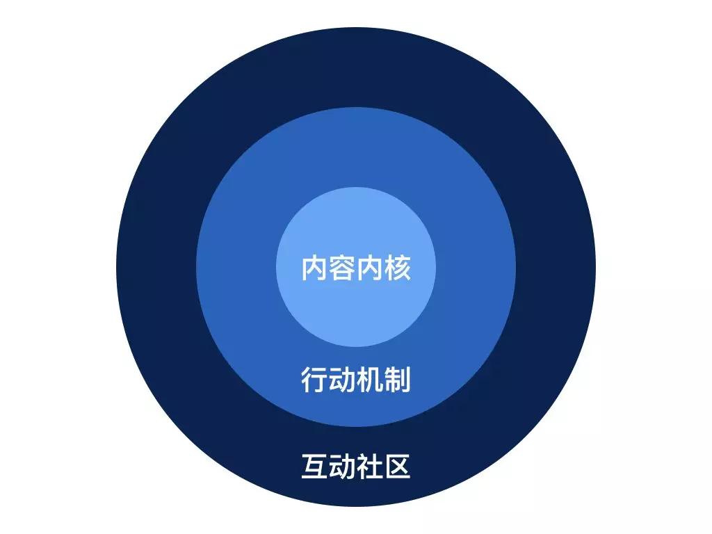归根结底,现在任何知识产品都是由“内容+服务”两大部分组成的。付费知识产品,优质内容是内核,但真正提供给用户的主要是服务,互联网也让服务变得容易。现在,多数互联网知识产品呈现从内容到服务的三环(如图):内核是优质内容;中间是用行动机制促进用户自己的行动;外环是互动社区,用户在其中相互互动。