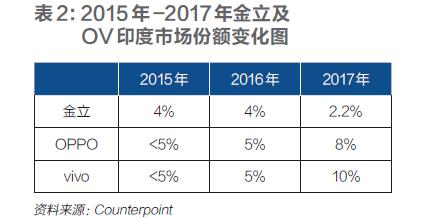Counterpoint research数据显示,2017年全年OPPO和vivo加起来已占据了印度智能手机市场18%的份额,而金立则只有2.2%。