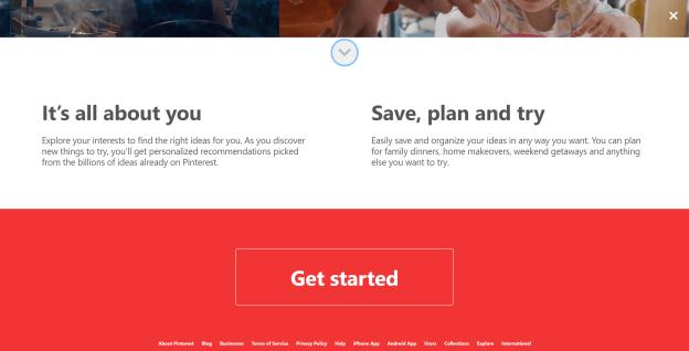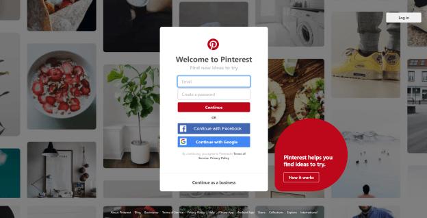 Pinterest采用了统一的注册和登录界面,友好型的行为召唤是直截了当的“继续”一词。它还为那些寻找登录按钮的用户设置了一个专用登录按钮。