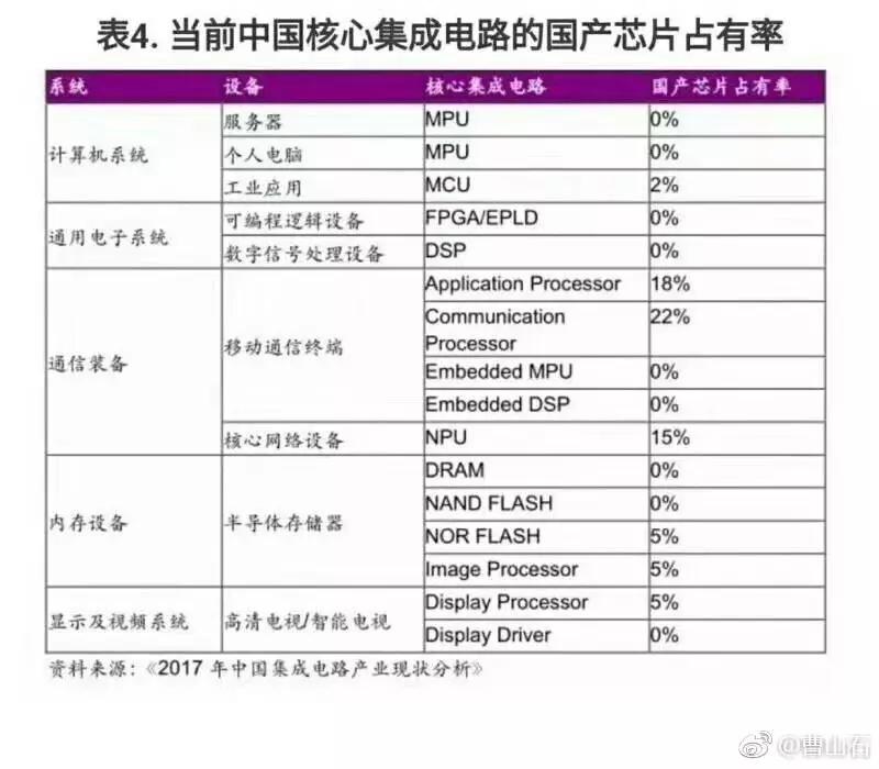 昨天,微博知名财经博主@曹山石po出一张图,显示当前中国核心集成电路国产芯片占有率状况。