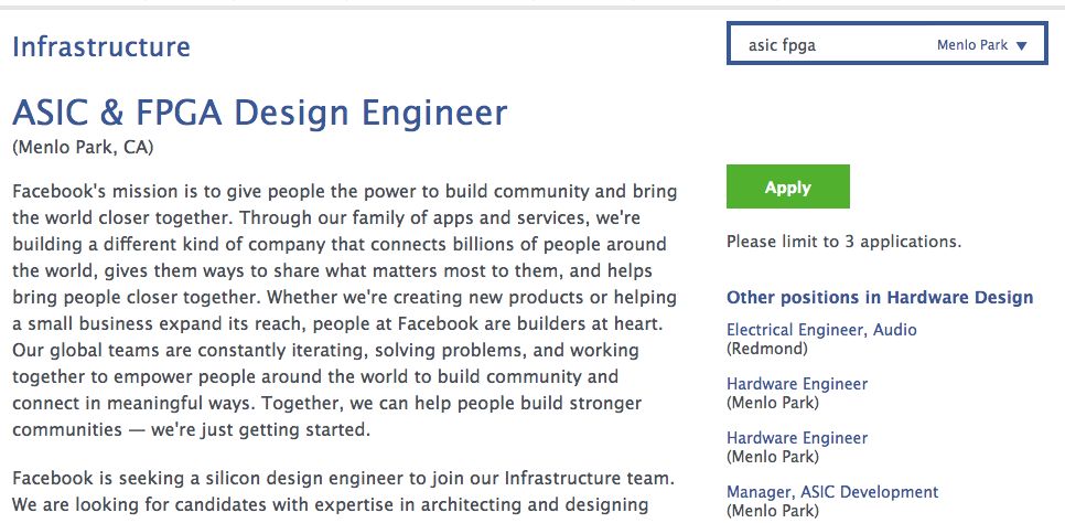 Facebook官方公告称,公司总部目前在招聘ASIC & FPGA设计工程师,候选人要求具有架构和设计半定制和全定制ASIC的专业知识,需要与软件和系统工程师合作,了解当前硬件的局限性,并利用他们的专业知识打造针对多种应用(包括AI/ML,压缩,视频解码等)的定制解决方案。