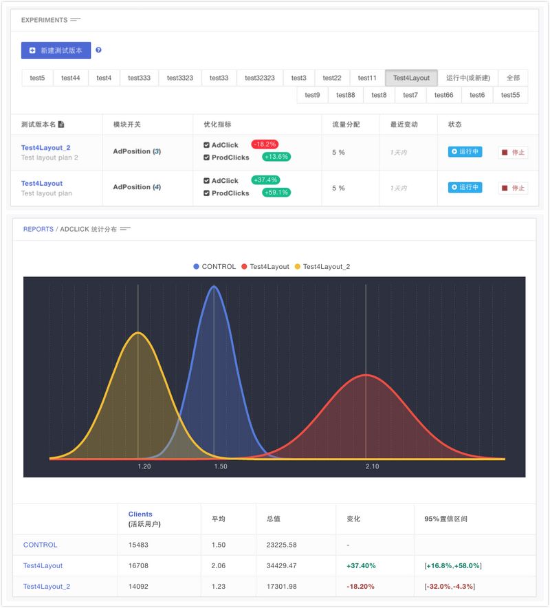 具体来讲,在产品迭代或营销活动过程中,开发者或运营人员可以利用 AppAdhoc 后台创建一些实验,通过控制接入用户量,比如 10% 以内,辅助决策产品的最终形态或营销方式。在分发机制上,吆喝科技研发了一套选取“可代表性采样”的流量分割算法,避免测试用户过度集中造成的结果偏差;并针对收集到的数据提供置信区间分析,过低的被认为是可信性较低。