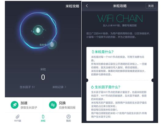在其界面中,小米WiFi链中存在“米粒”与“生长因子”两种不同形式。“米粒”即小米链生态中的通货,总量有限,每日产量固定,获取难度随时间推移增大,且可用于消费和兑换。