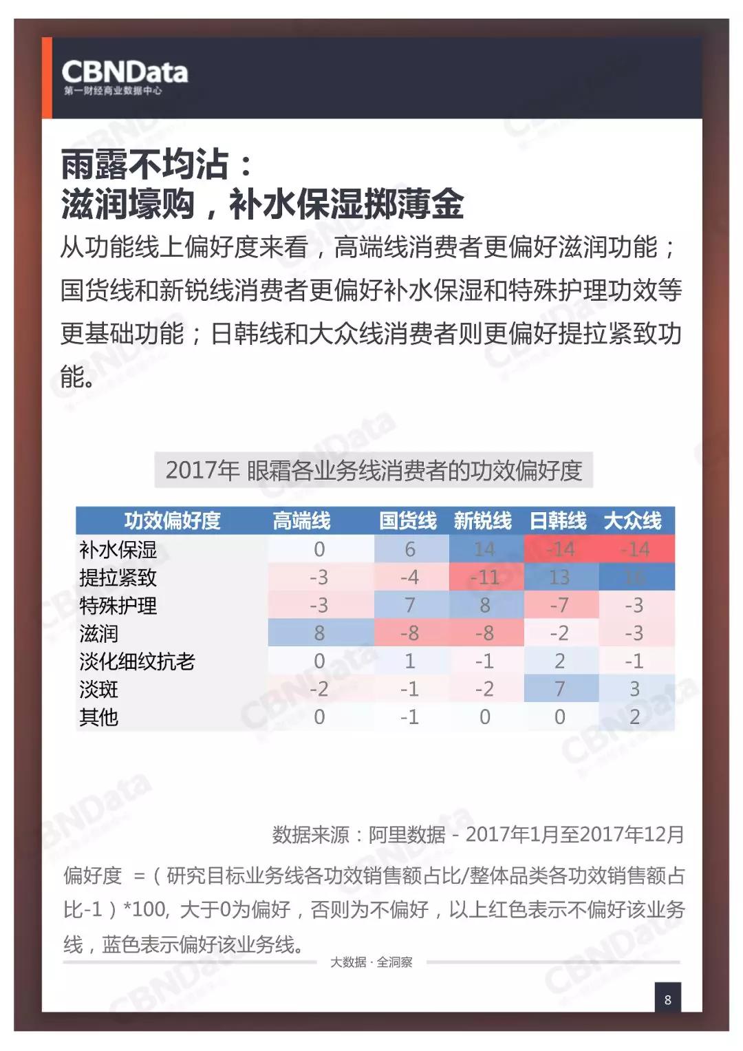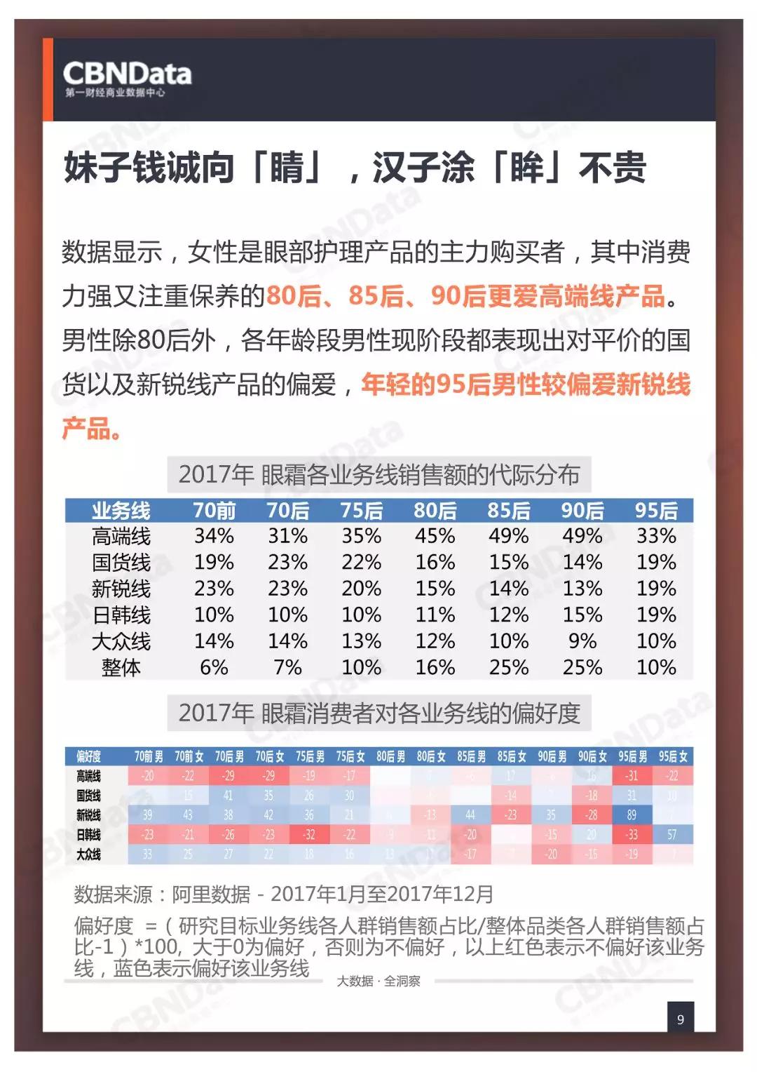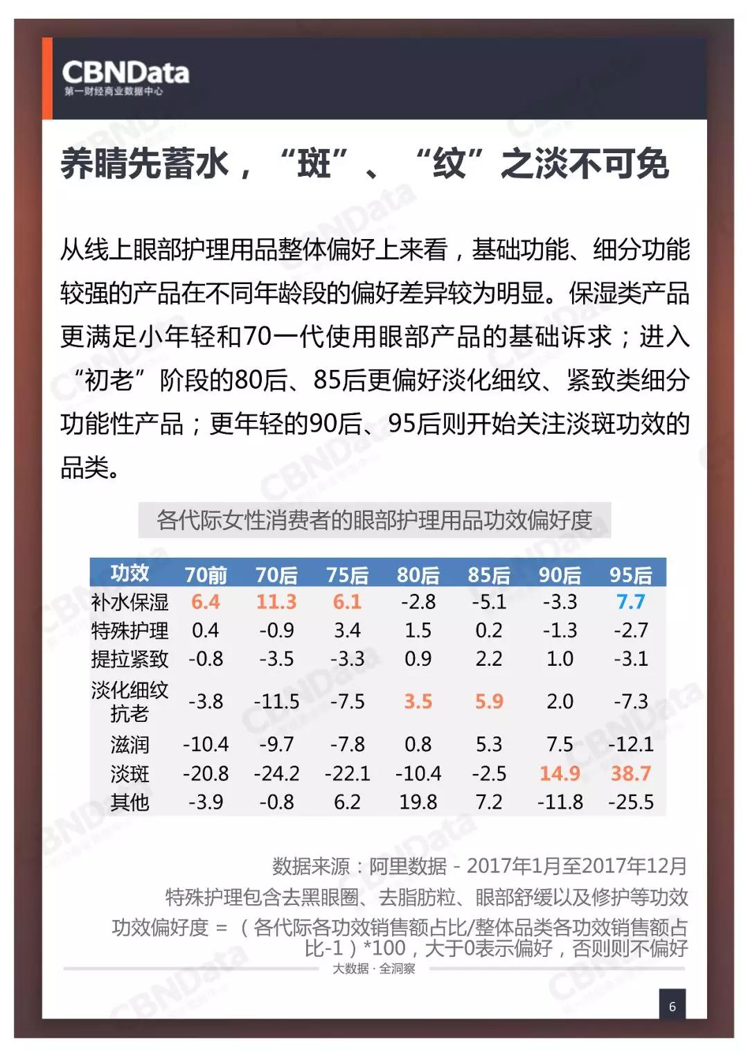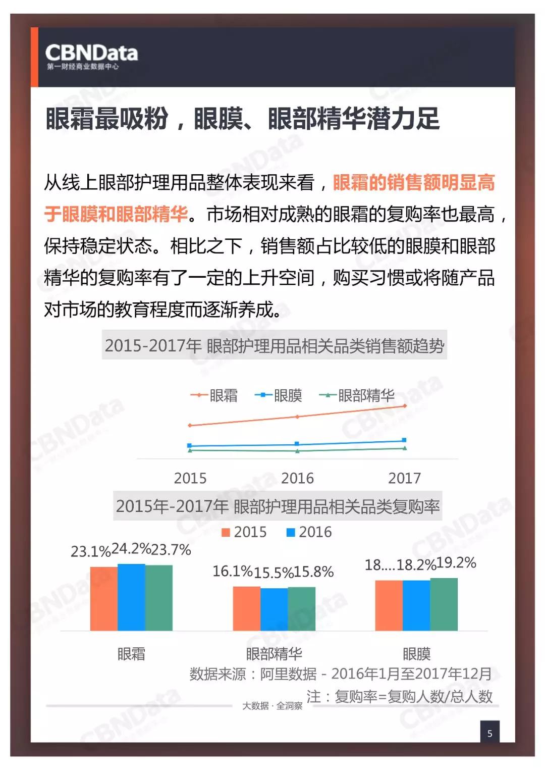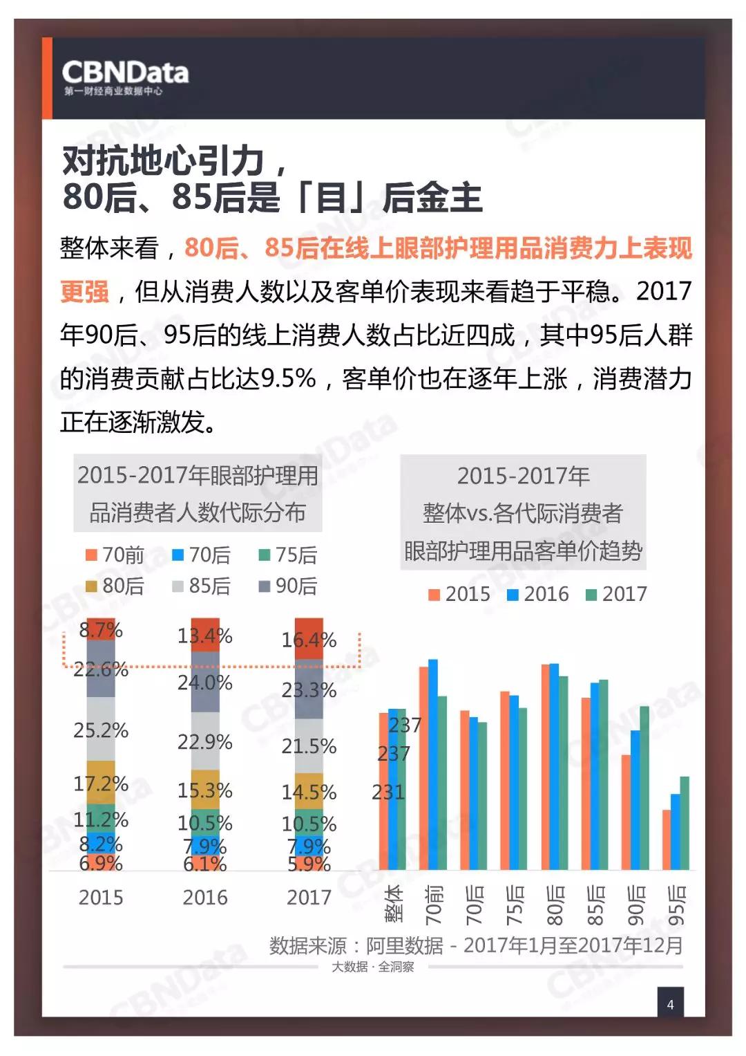 近日,第一财经商业数据中心(CBNData)发布了《2017线上眼部护理用品相关消费系列研究》,基于阿里数据,通过洞察 2015年1月至2017年12月线上各年龄段消费人群对眼部护理用品的偏好特征以及购买行为,还原眼部护理用品的消费现状。