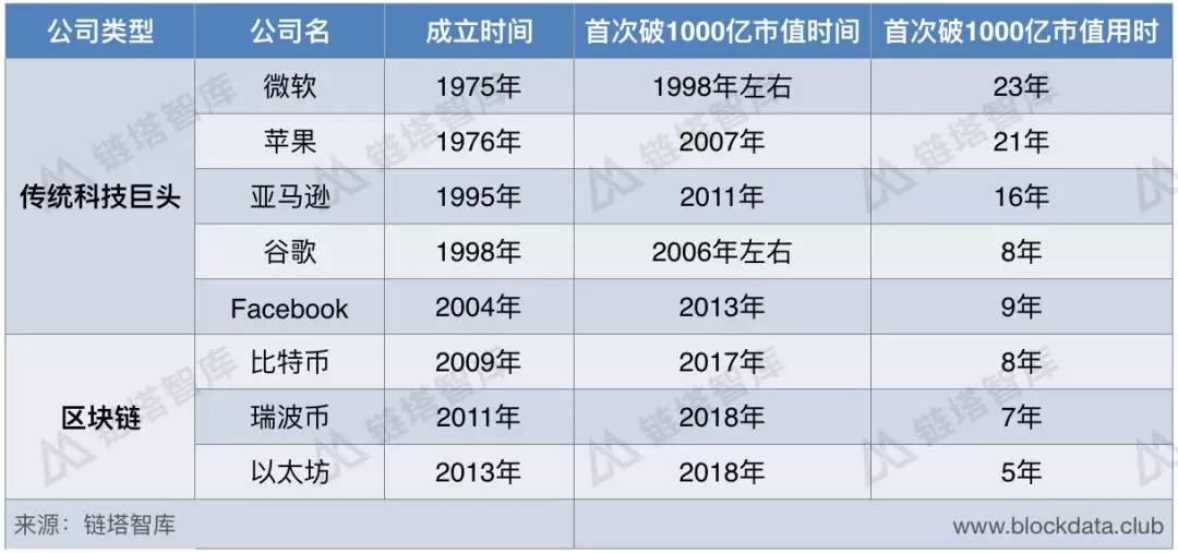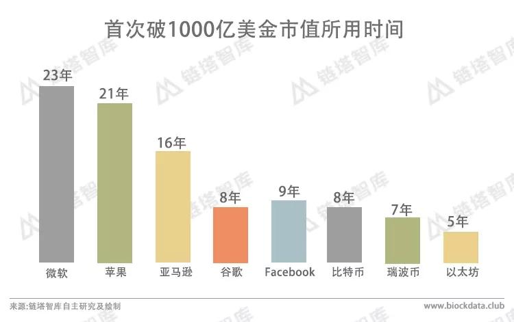 与这些传统巨头相比,区块链(主要为虚拟货币)的市值破千亿美元的时间大大缩短,以太坊更是成立5年市值即破1000亿美元。