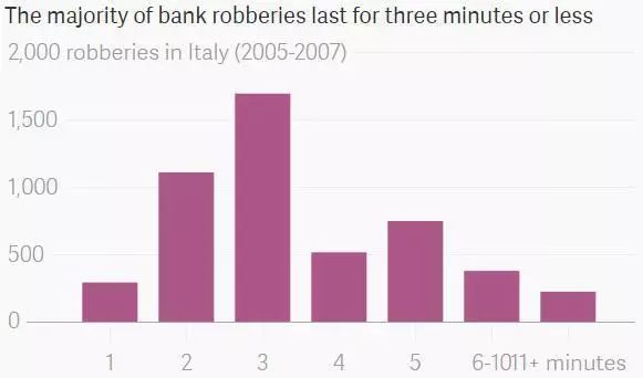 下图是犯罪学家对几千起银行抢劫案持续时间的统计,结果表明,最常见的是3分钟。而且在3分钟和4分钟之间,有一个明显的断档。这说明,劫匪一定是事先给自己设定了3分钟的期限。
