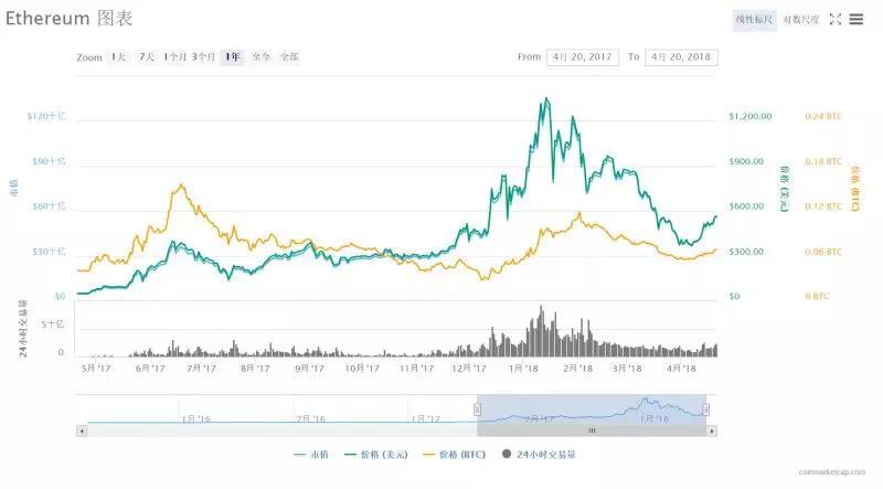 ETH价格最高时近1432美元。而价格最低时为368美元。跌幅也达近70%。