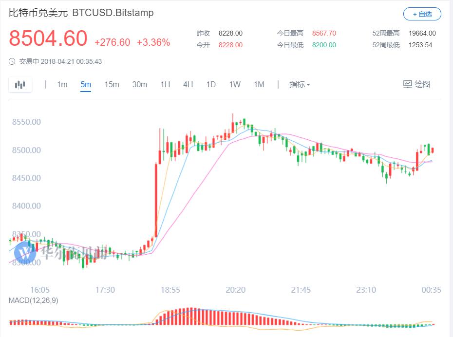 北京时间20日本周五晚间,Bitstamp平台的比特币交易价一度升破8560美元,创将近四周来新高,日内涨逾4%。截至发文,比特币回落到8500美元左右,最近24小时涨幅仍有3%以上。