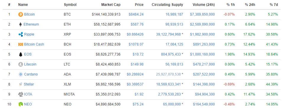 截至发文,市值前十的数字货币最近24小时普涨,涨幅最大的瑞波币涨逾17%。