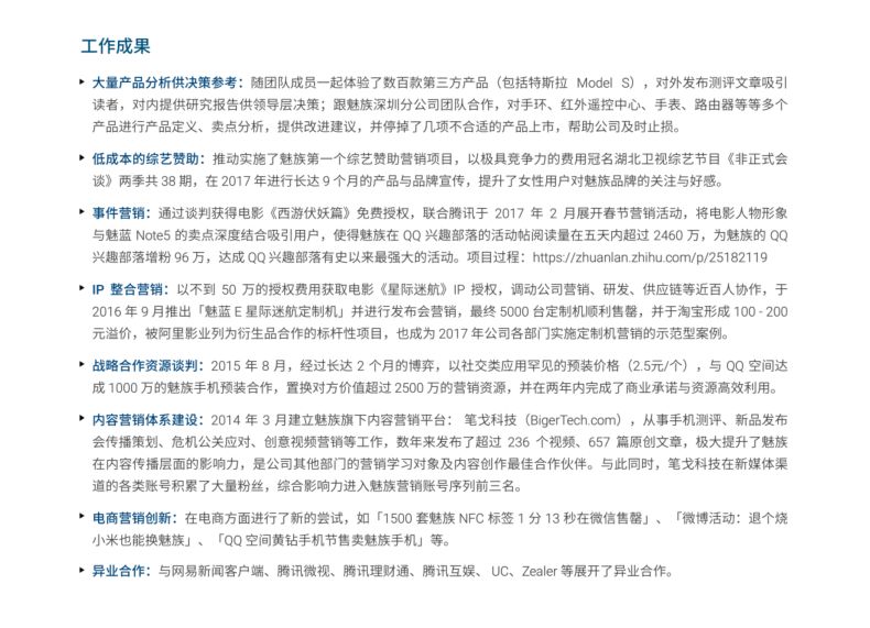 一句话概括就是:我们为魅族近 5 年在内容营销、智能硬件生态圈拓展、资源置换合作等方面做出了贡献,参与了近 20 款手机及周边产品的发布及上市,实现魅族智能硬件平台从无到有的建设,连续两次成功创建内容营销新媒体,分别是针对手机行业的“笔戈科技”和针对汽车行业的“⽼司机来了”,后者已由离职员工从魅族买断并独立运作。