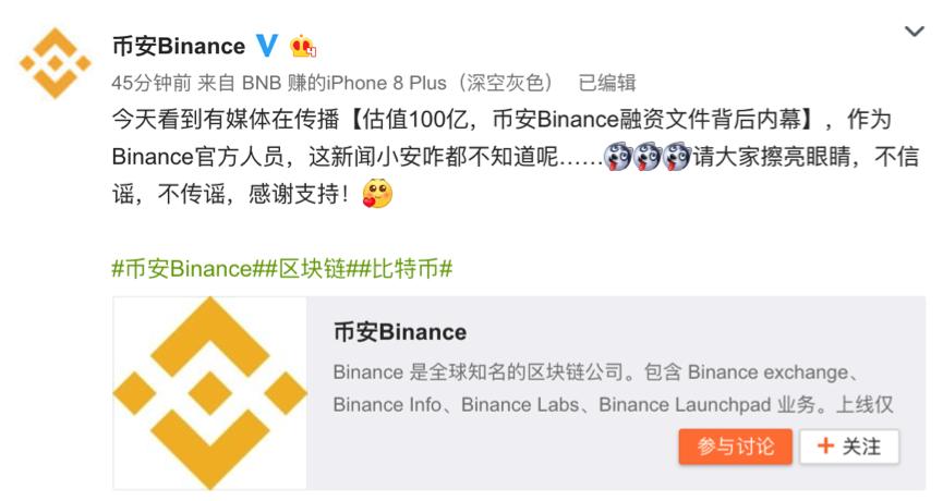 4月22日,有媒体称币安以100亿美金估值正在寻求新一轮融资,币安官方微博表示,作为Binance官方人员,并不知晓这一消息,同时提醒“请大家擦亮眼睛,不信谣,不传谣”。