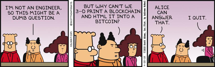 知名漫画家斯科特·亚当斯近日用其创作的漫画作品角色“呆伯特(Dilbert)”来讽刺那些喜欢谈论区块链技术的企业高管,而他们对这个新兴行业其实一无所知。去年十月,斯科特·亚当斯还推出了初始代币发行(ICO)讽刺漫画。虽然亚当斯一直在讽刺区块链和初始代币发行,但他创立的WhenHub公司正在启动一个代币销售项目,希望在今年九月之前募集4000万美元。