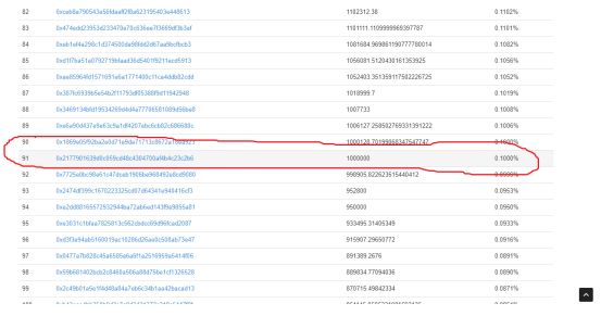 备注:不要觉得100万个EOS很多,根据ethscan显示,持仓超过100万EOS的地址有91个。