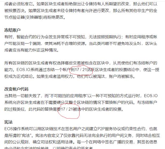 同时,在EOS的宪法中,17/21是一个非常特殊的数。超过17人同意代表着几乎可以更改EOS的代码/宪法/区块链数据等一切。