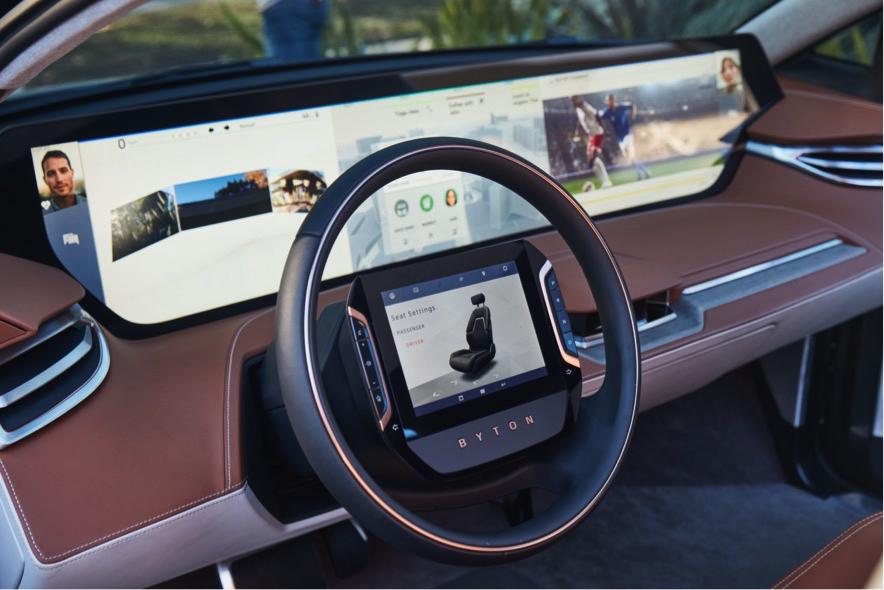 据讲解员介绍,这款车一共有四款智能屏。在最前方,是全球首个驾驶员触控屏(Driver Tablet)——长125cm、高25cm(49英寸),使用了拜腾自研的开放式数字云平台(BYTON Life)。