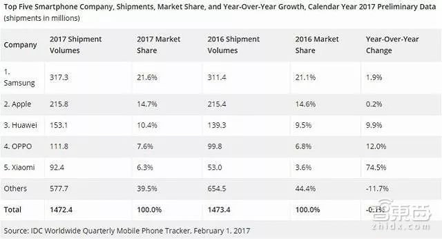 ▲今年2月IDC发布的2016/2017年全球智能手机出货量排名报告