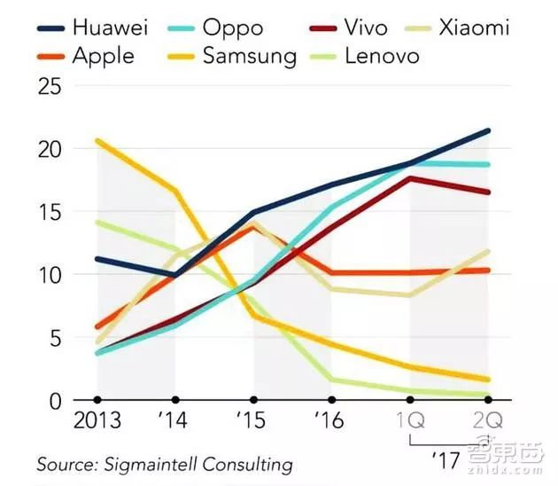 上图是来自市场咨询机构Sigmaintell在2017年上半年的研究数据,我们从图中可以看见,自从2013年以来,华为、小米、vivo、OPPO这四大国产品牌都在快速崛起,尤其是华为、vivo和OPPO,自2013年以来都几乎是以直线抬升的涨势在掠夺中国市场。