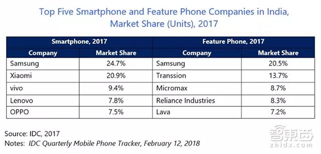 而根据IDC数据,在2017年印度销量前五的手机品牌中,只有三星一家是海外品牌,其余四家均来自中国:小米、vivo、联想(摩托罗拉)、OPPO。