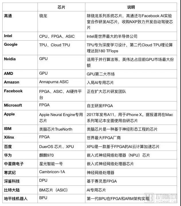 根据腾讯研究院2017年发布的《中美两国人工智能产业发展全面解读》报告显示,从基础层的芯片企业数量来看,美国有33 家,中国有12 家。美国既有谷歌、英特尔、IBM等科技巨头,也有高通、英伟达、AMD、赛灵思这样的芯片大佬,还有不少发展良好的中等规模公司和活跃的初创企业。