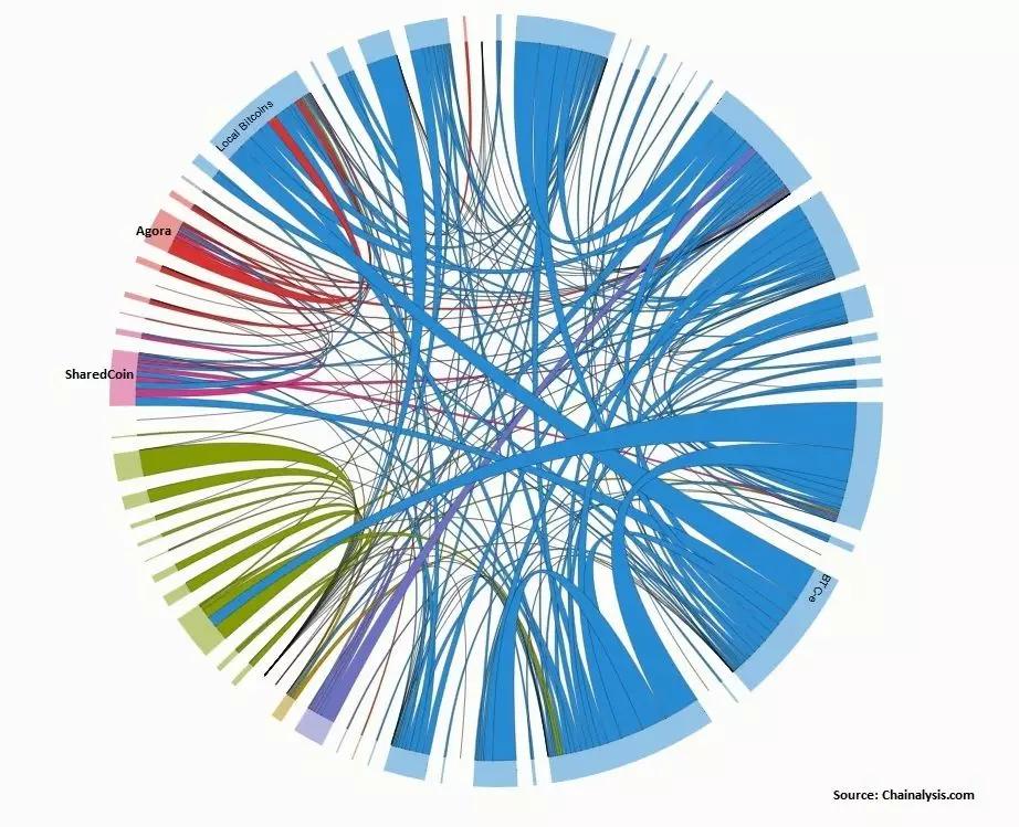 据 Chainalysis 于 2015 年的数据可视化,追踪包括 Bitfinex、Bitstamp、BTCC、BTC-e、Circle、Coinbase、Huobi、itBit、Kraken、LocalBitcoins、OKCoin、Xapo 等的比特币交易数据,图表中只标注了 BTC-e、LocalBitcoins 的数据