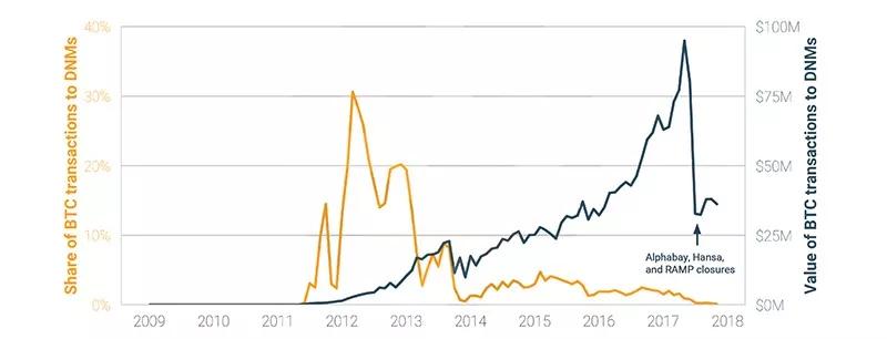 据 Chainalysis 数据分析,暗网已不再是比特币的主要用途,比特币交易比例从 2012 年的 30% 降至 2017年以后不足 1%,尽管绝对价值增加,2017 年比特币转入暗网市场约合 6.6 亿美元