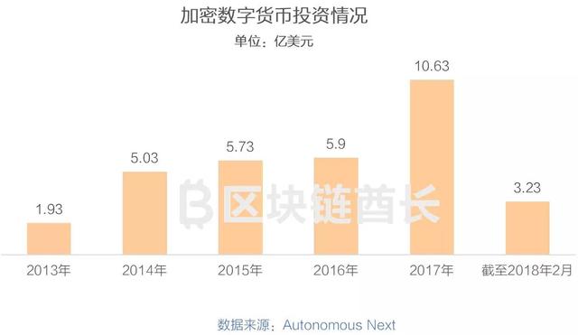加密数字货币领域的投资和并购也非常活跃,根据Autonomous Next的数据,2017年,有10.6亿美元的资金投入到了加密货币实体中,截至2018年2月底,数字货币领域已获得3.23亿美元的投资。