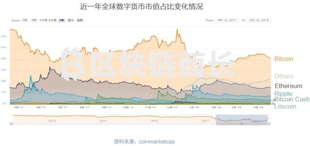 目前比特币的市值约为1396亿美元,占数字货币总体市值的46.1%,从近一年全球数字货币市值占比变化图中可以明显看出,比特币的价值波动影响着整个数字货币市场市值的变化。