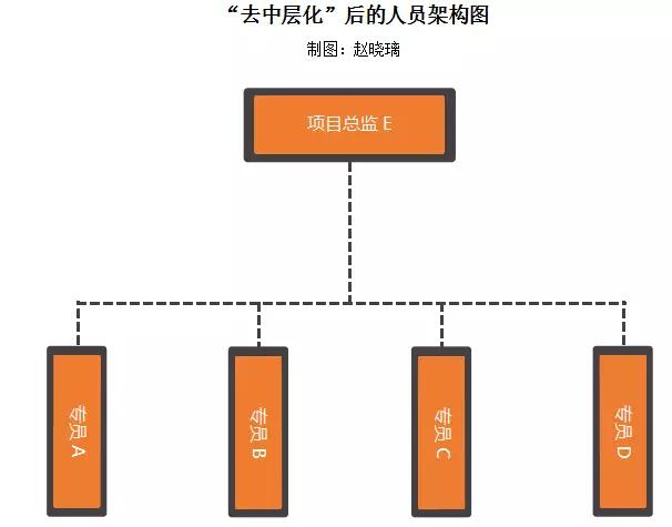 此时,该行业市场环境发生了变化,项目有时多有时少,这笔支出慢慢成为企业高额负担,为了更好地应对变化,公司在人员结构上实行“去中心化”:取缔项目主管这一中层职位,设置四名项目专员,再根据不同的项目进行内部竞聘项目负责人制度,也就意味着,任何人都有可能变成某个项目的负责人,等项目结束,这个职位的使命也随之结束。