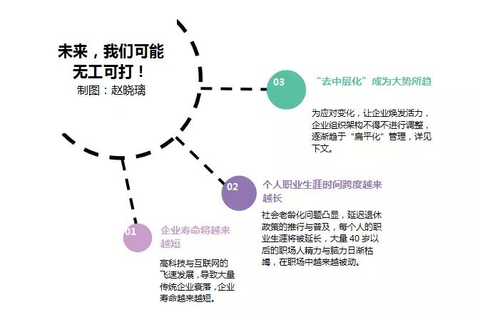因为未来,传统企业或组织的寿命会越来越短;而与之对应的,是延迟退休年龄等政策,也就意味着,每个人的职业生涯时间将越来越长。
