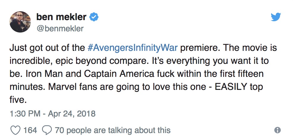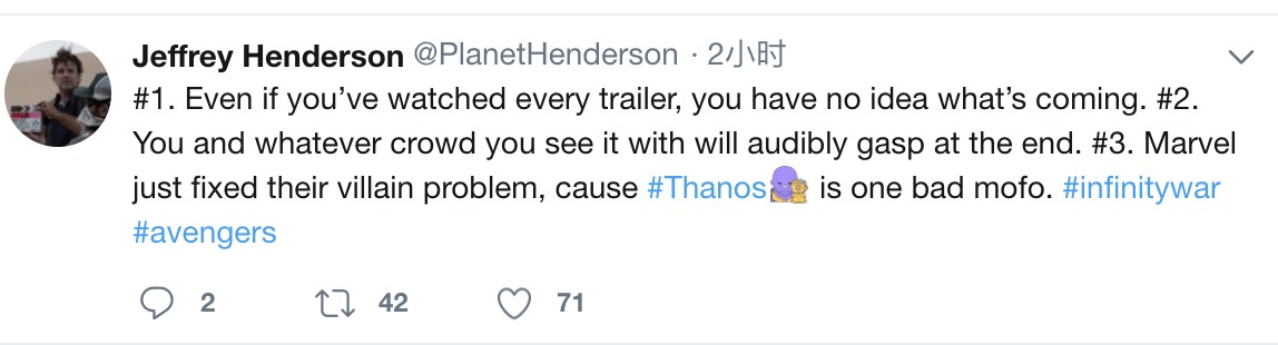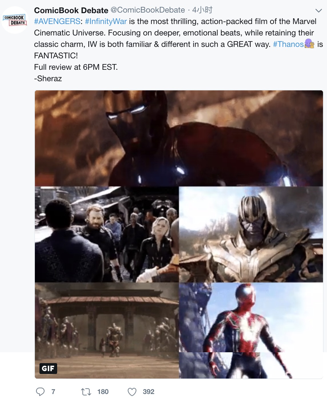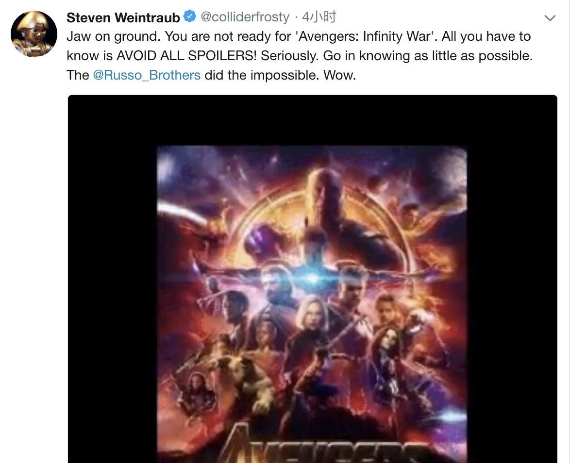就在刚刚,《复联3》的社交口碑正式解禁,第一批观看首映的观众纷纷在社交媒体发表评论,意味着第一批剧透也来了。