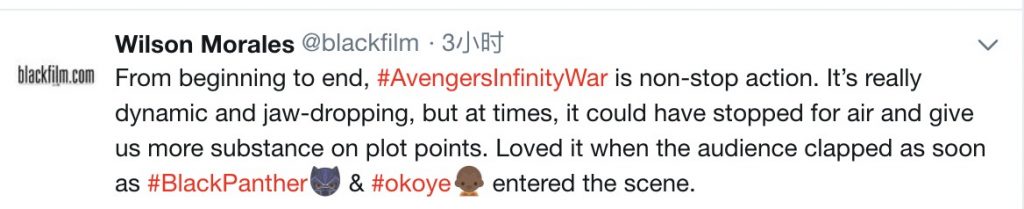 这部电影从都头到尾打个不停,充满变数、令你瞠目结舌。不过有时节奏也会慢下来,让你跟上剧情。当黑豹和他的护卫奥克耶出场时,全场观众都开始欢呼鼓掌。