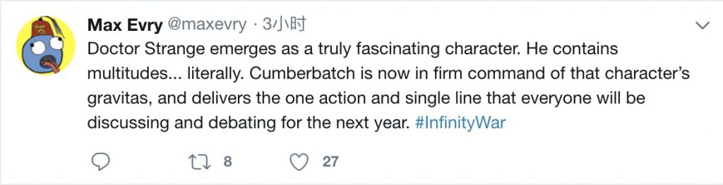 电影网站 ComingSoon.net 的记者 maxevry 则称赞了奇异博士这个角色: