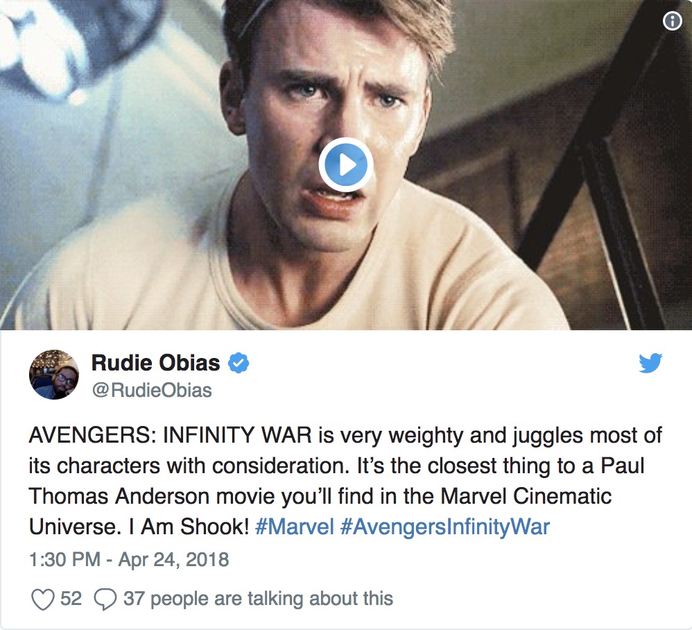 《复联 3》是一部重量级的电影,里面角色的塑造大都是经过深思熟虑的,这是漫威电影宇宙中非常接近 Paul Thomas Anderson (奥斯卡提名影片《魅影缝匠》导演)风格的电影,我被震撼了!