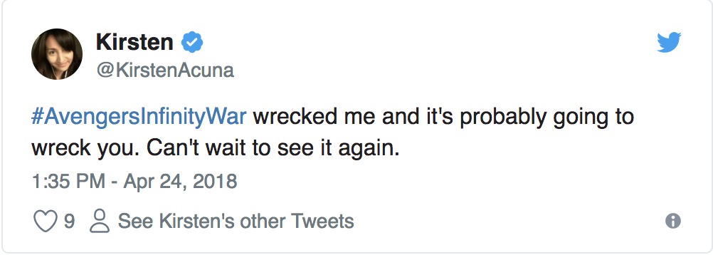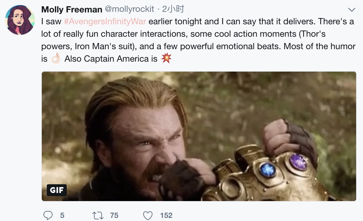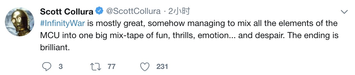 《复联 3》太棒了!几乎把漫威电影宇宙的元素组合在了一起,成为一部有趣的、刺激的、情感丰富的以及令人绝望的电影,结局很赞。