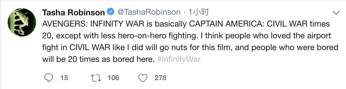 The Verge 编辑 Tasha Robinson 暗示了《复联 3》中会有多场大战: